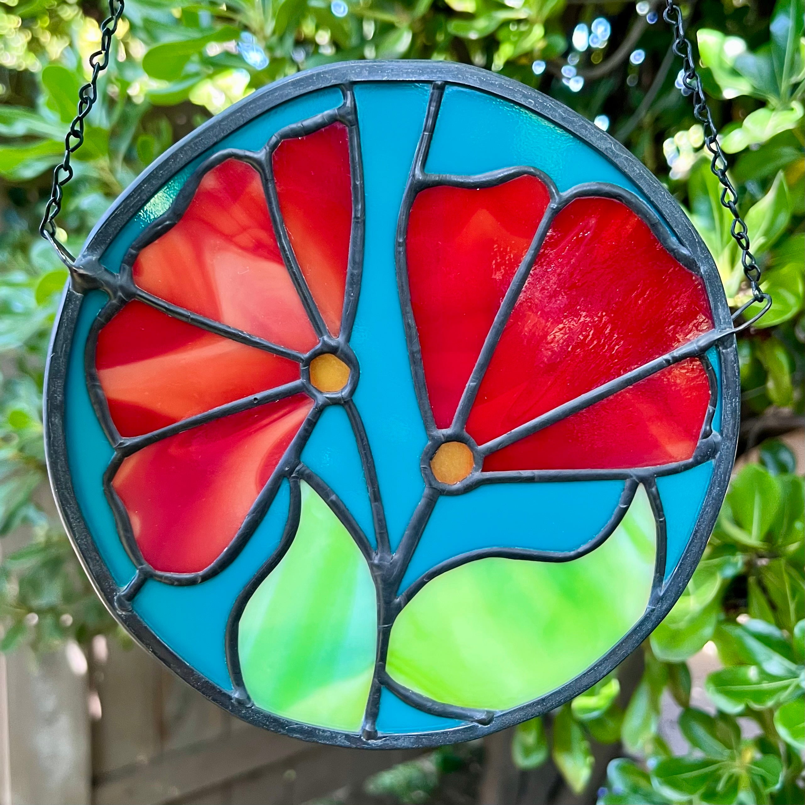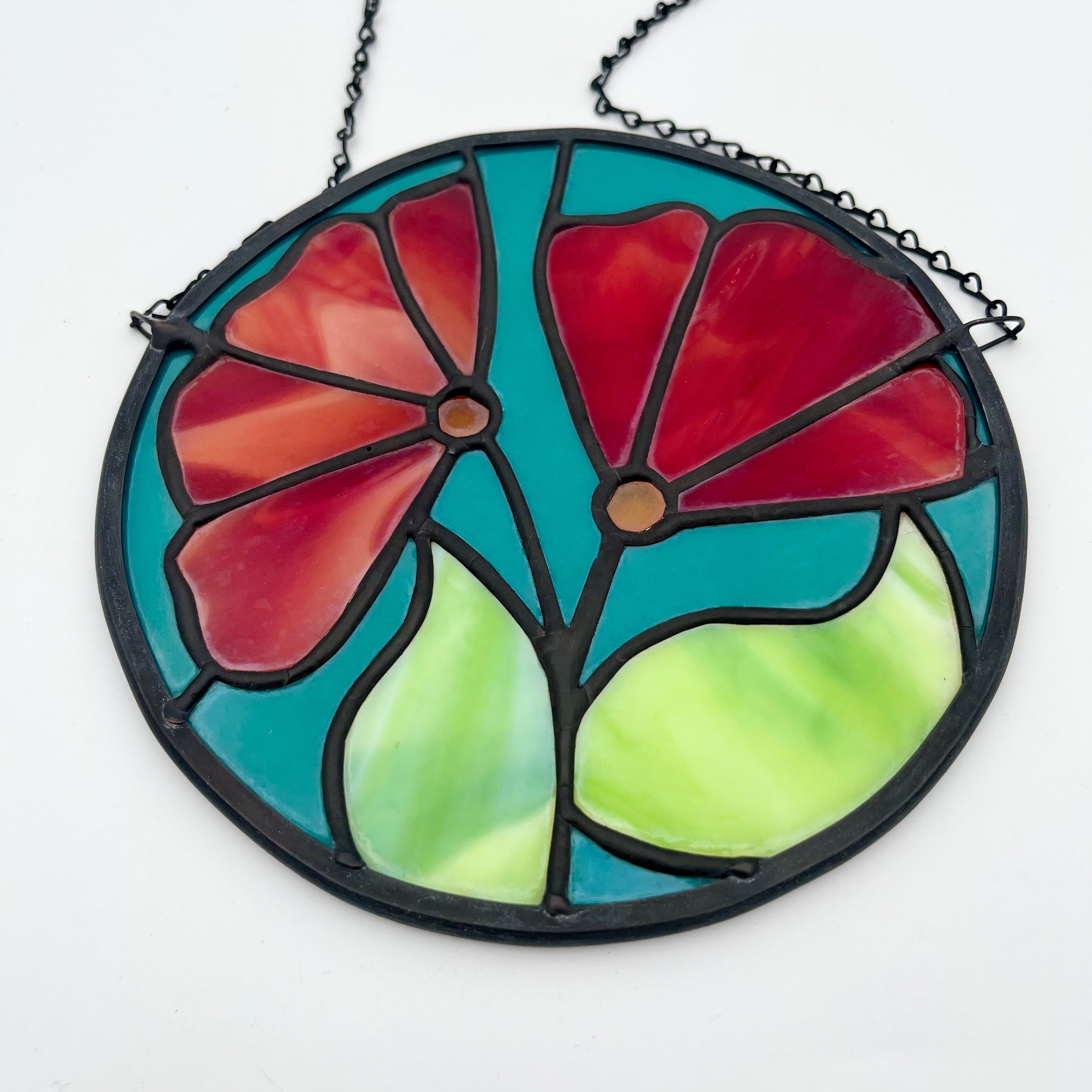 Swirly red stained glass makes the petals of two flowers complete with green leaves and a turquoise backdrop. Measures approximately 6" in diameter.