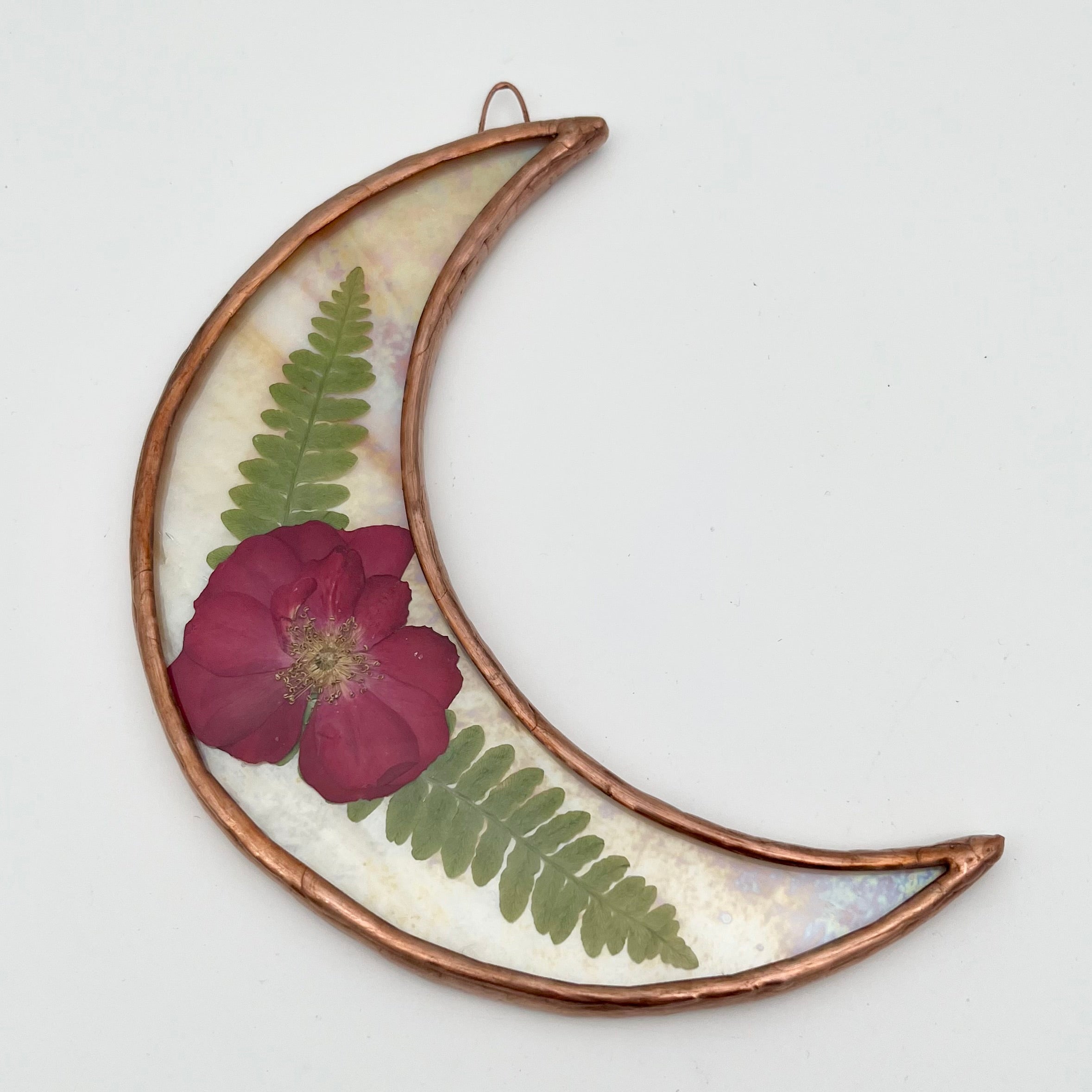 Iridescent light Amber glass forms an elegant crescent moon topped with a pressed rose and ferns. Measures approximately 6" from top to bottom.
